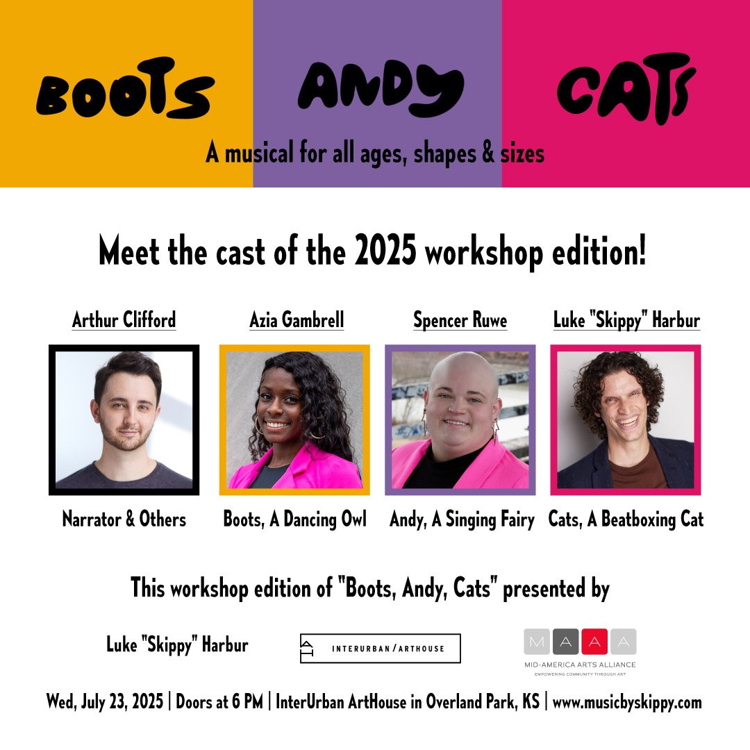 Boots, Andy, Cats: a musical for all ages, shapes, and sizes debuted in July 2025 thanks to a performance grant collectively funded and distributed by National Endowment for the Arts, Mid-America Arts Alliance, and InterUrban ArtHouse in Overland Park, KS.